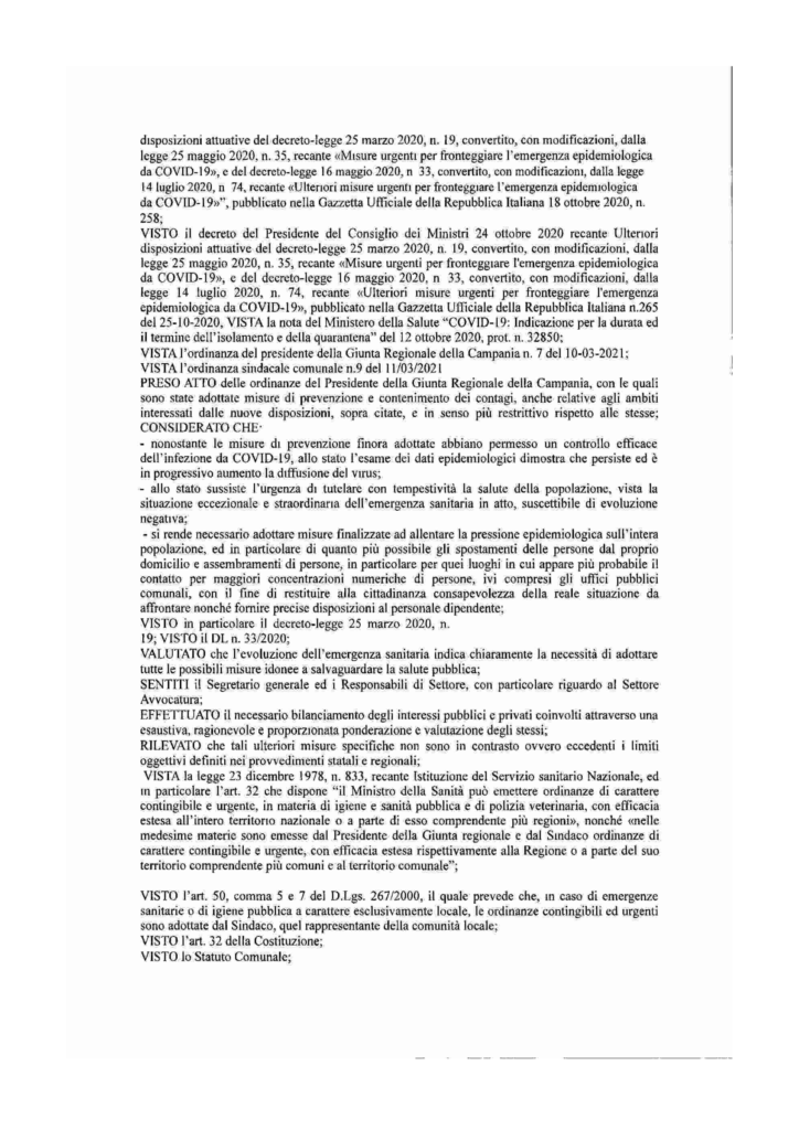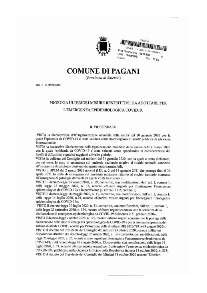 Al fine di contenere, contrastare e prevenire ulteriormente il diffondersi del Covid-19, il vicesindaco Valentina Oliva con ordinanza n. 10 del 19-03-2021 ha disposto con decorrenza immediata e fino al 31/03/2021 la proroga delle ulteriori misure restrittive contenute nell’ordinanza sindacale n. 9 del 11/03/2021 e la chiusura del civico Cimitero nei giorni festivi e prefestivi.