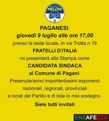Oggi, giovedì 9 Luglio alle ore 16,30 presso la sede di Fratelli d’Italia sita in via Trotta n°19, verrà presenta alla stampa Enza Fezza, candidata Sindaca al Comune di Pagani.