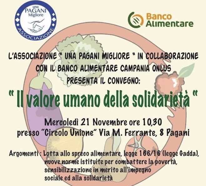 Mercoledì 21 Novembre alle ore 10.30 presso il circolo unione sito in via M. Ferrante n.8, si terrà un convegno denominato “il valore umano della solidarietà”, in cui interverranno anche il direttore del Banco Alimentare Campania Onlus Roberto Tuorto, ed il direttore dell’azienda consortile Agro Solidale Porfidio Monda.