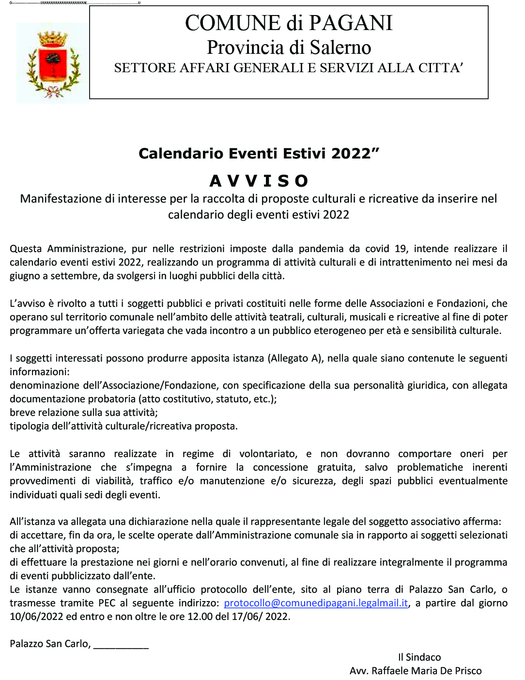 I soggetti interessati possono produrre apposita istanza (Allegato A). Le istanze vanno consegnate all’ufficio protocollo dell’Ente, sito al piano terra di Palazzo San Carlo, o trasmesse tramite PEC al seguente indirizzo: protocollo@comunedipagani.legalmail.it, a partire dal giorno 10/06/2022 al 17/06/ 2022.