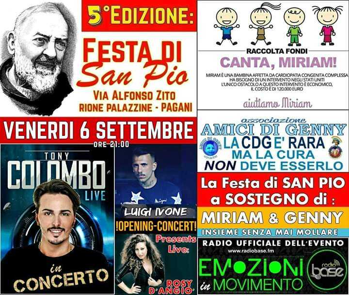 Appuntamento con una festa di popolo, di gente vera e verace, appuntamento con la quinta edizione della festa di San Pio, omaggio dovuto e sentito al frate cappuccino più famoso della storia. Via Zito, venerdì 6 settembre, rione Palazzine. E’ qui la festa. Star della serata, assieme a tanti altri artisti, sarà l’ormai notissimo Tony Colombo. Ma oltre alla musica e al puro e sano divertimento, ci sarà anche uno spazio importante per la solidarietà, tutto dedicato alla raccolta fondi per Miriam, la bambina di Cava che ha assolutamente bisogno di un’operazione delicata e importante.