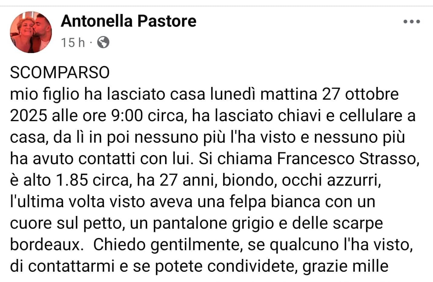 La madre, Antonella Pastore, ha lanciato un accorato appello sui social network chiedendo aiuto a chiunque possa avere informazioni utili al ritrovamento del figlio.  “Si chiama Francesco Strasso, è alto circa 1 metro e 85, biondo, con occhi azzurri. L’ultima volta che è stato visto indossava una felpa bianca con un cuore sul petto, pantaloni grigi e scarpe bordeaux. Chiedo gentilmente, se qualcuno l’ha visto, di contattarmi. Vi prego di condividere, grazie mille”, scrive la donna.
