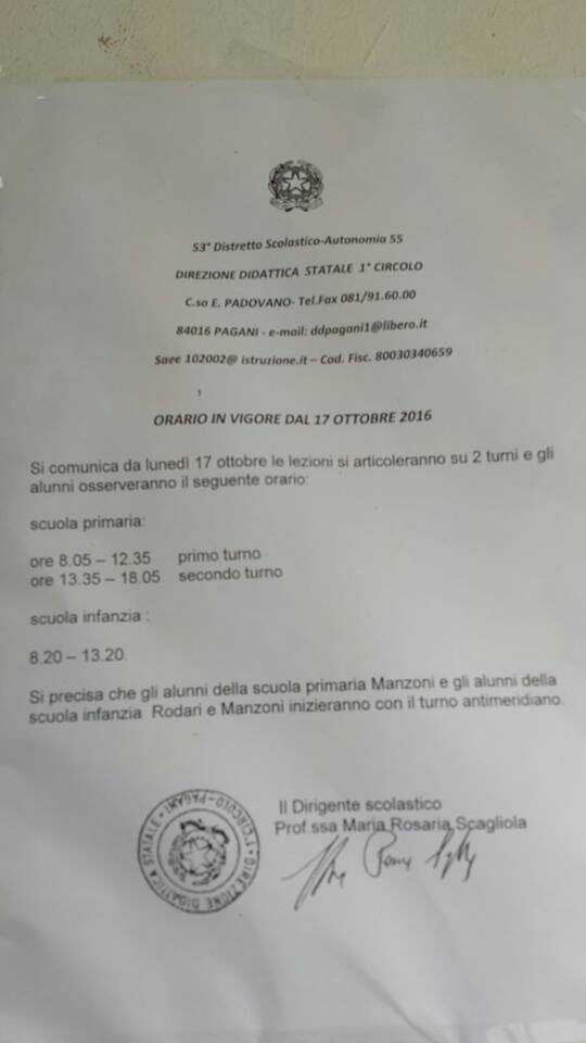 E’ deciso, da lunedì partono i doppi turni per i bambini del I circolo didattico di Pagani. La sorpresa, poi non tanto “sorpresa”, è arrivata alle 12.00. L’avviso è stato pubblicato sulle bacheche del plesso Rodari. “Si comunica da lunedì 17 ottobre le lezioni si articoleranno si 2 turni e gli alunni osserveranno il seguente orario. Scuola primaria ore 8.05 – 12.35 (primo turno) ore 14.35-18.05 (secondo turno); Scuola dell’Infanzia ore 8.20 -13.20. Si precisa che gli alunni della scuola primaria Manzioni e gli alunni della scuola infanzia Rodari e Manzoni inizieranno con il turno antimeridiano”.