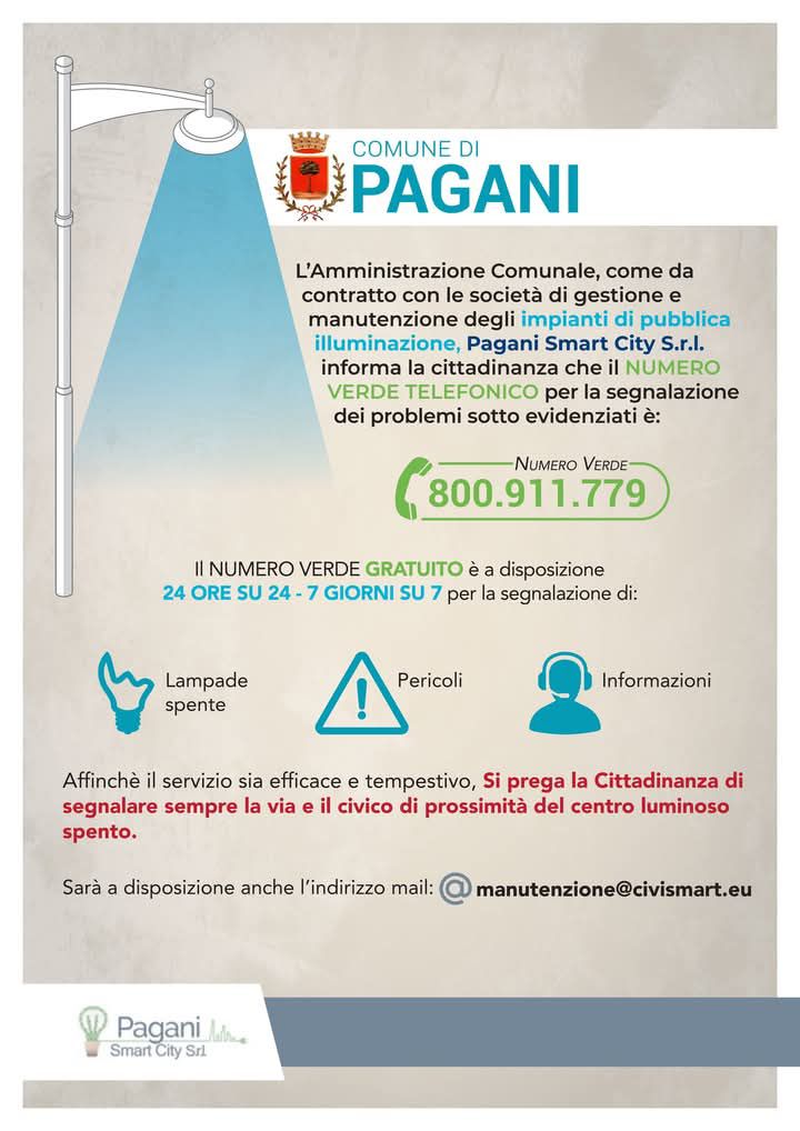 A rendere la situazione ancora più complessa è la recente introduzione di un numero verde per la segnalazione di guasti alla pubblica illuminazione. Attivo sette giorni su sette, il numero 800911779 è stato accolto con entusiasmo dai cittadini. Tuttavia, la realtà dei fatti ha dimostrato che le promesse di un servizio efficiente sono lontane dalla verità. Dopo aver segnalato un guasto a un lampione in via De Gasperi, i cittadini hanno atteso invano per oltre una settimana senza ricevere alcun intervento. Dicasi lo stesso per il consigliere comunale, ora in maggioranza, Vincenzo Violante che ha segnalato la notizia a Pagani Smart City per mancanza di illuminazione in via Filettine, ma non ha ricevuto riscontro e quindi ha chiamato telefonicamente al Comando dei vigili urbani.