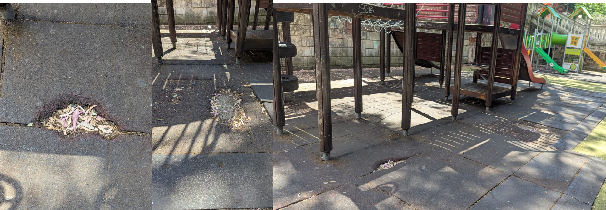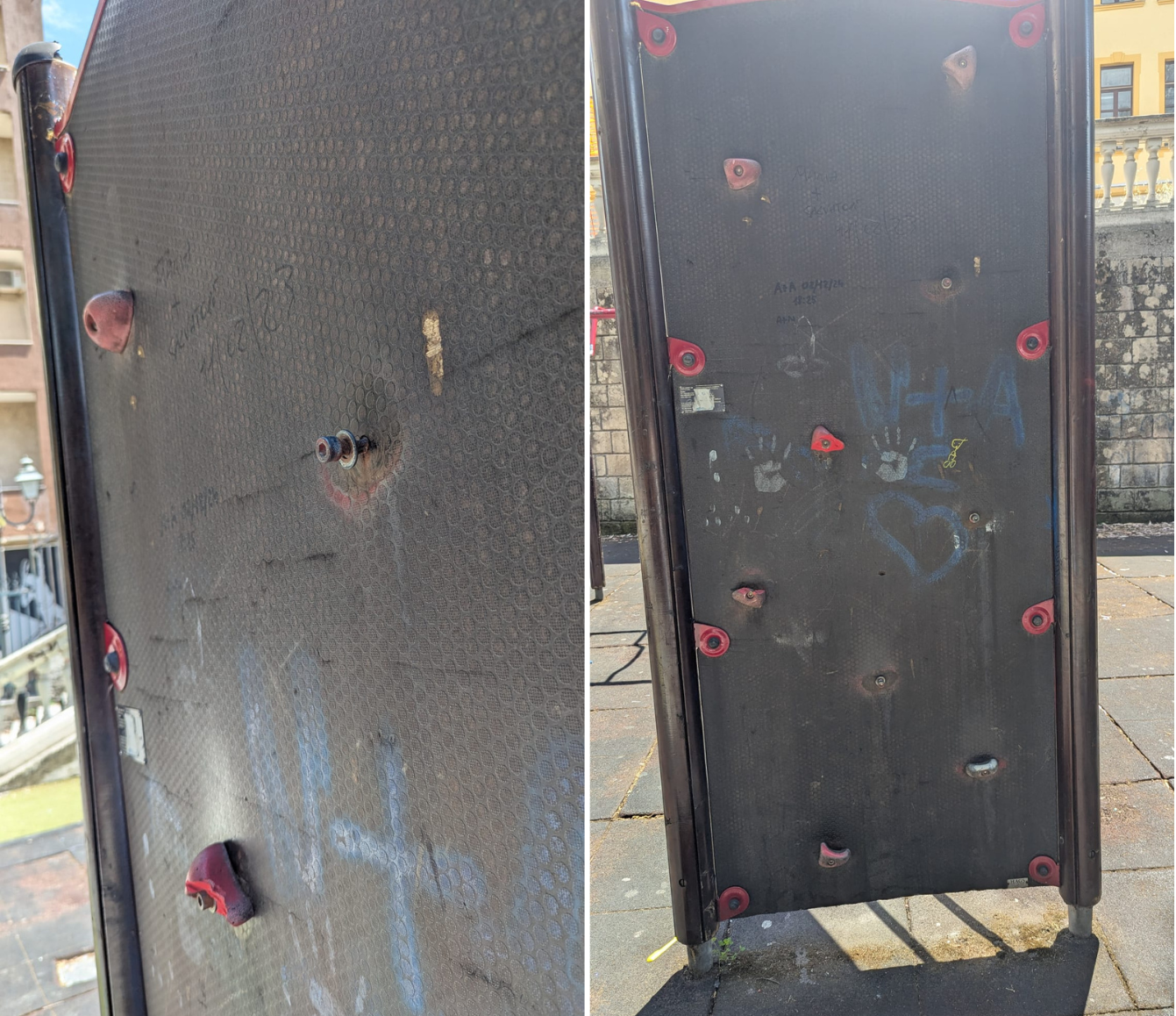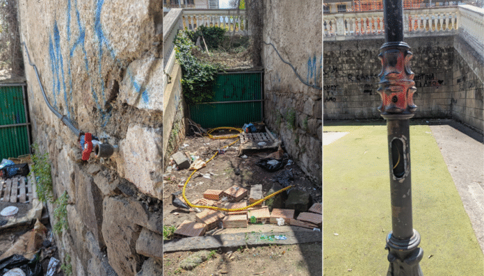 Un palo della luce, se così si può ancora definire, è smembrato al cui interno si vedono i fili dell’elettricità. Se vogliamo impegnarci a seguire con coerenza il discorso di rimuovere le “giostrine pericolanti” allora, forse, si sarebbe salvato solo uno scivolo. Sull’altro lato della villa comunale, la parete per arrampicata è danneggiata, lo scivolo attrezzato è rattoppato, in basso ci sono giochi che poggiano su basi di ferro arrugginite, la pavimentazione antitrauma è pericolante, il “nuovo” scivolo di colore verde è danneggiato e fuoriesce una parte di ferro dove i bambini possono ferirsi.