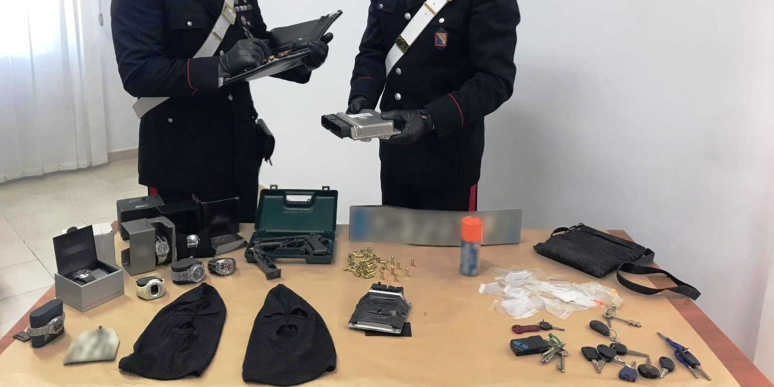 In entrambi i casi, avevano avvicinato le vittime in sella a un ciclomotore e dopo averle spinte e fatte cadere a terra per poi depredarke di borselli contenenti denaro ed effetti personali. Le perquisizioni eseguite nel corso delle indagini, inoltre, avevano portato al rinvenimento in casa del primo fermato di olio per lubrificare armi, una pistola replica di semiautomatica simile a quelle in dotazione alle FFOO, 47 cartucce calibro 7,65 e 2 passamontagna nonché di orologi, centraline e chiavi scodificate per autovetture.