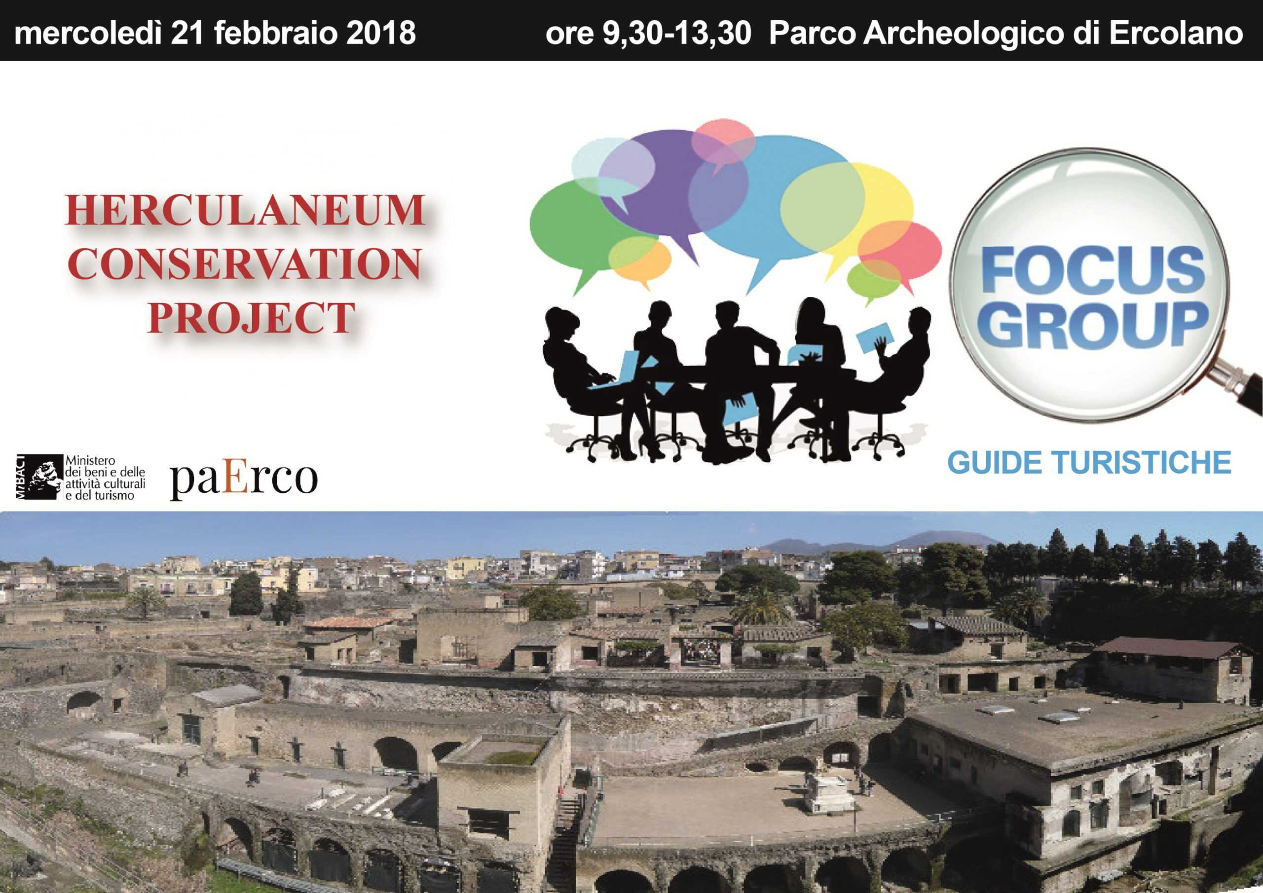Il Focus group è una tecnica di rilevazione per la ricerca sociale basata sulla discussione tra un piccolo gruppo di persone, invitate da uno o più moderatori a parlare tra loro, nello specifico, dell’argomento oggetto di indagine. Il Focus group del Parco di Ercolano ha lo scopo di monitorare e registrare, attraverso la voce delle guide turistiche, opinioni, suggerimenti, critiche e aspettative dei gruppi di visitatori del sito, su modalità di fruizione, attività di valorizzazione e coinvolgimento e possibili progettualità future.