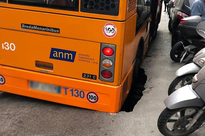 Un autobus dell’Anm, l’azienda napoletana per la mobilità in servizio sulla linea 128, è sprofondato stamani in una voragine che si è aperta in via Aniello Falcone, nel quartiere Vomero a Napoli.