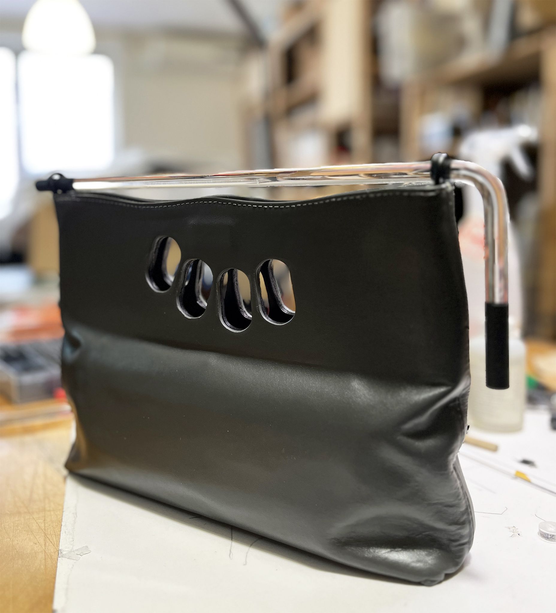 Il punto di partenza è l’“impugnatura”, la cifra stilistica ideata da Anatomie nel 1997: una forma che non è solo funzione, ma memoria tattile del corpo umano, con un’attenzione particolare alla mano, strumento primario di creazione e relazione. È lì che Coppeta entra in scena, con un gesto quasi chirurgico, incidendo la materia, svelandola, smontandola per riscriverla. La pelle, materiale vivo, diventa superficie di narrazione. Un accessorio si trasforma così in corpo mutante, un ibrido tra artigianato e sperimentazione, dove la forma è sempre in divenire.