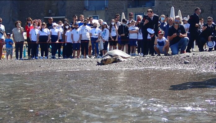 Nicolantonio è stato fortunato, grazie alla sensibilità del pescatore che l’ha ritrovato. Ha risposto bene alle prime cure, ad opera del veterinario del Turtle Point di Portici, Andrea Affuso, e piano piano si è ripreso. Dopo una decina di giorni era fuori pericolo. Ora la ritrovata libertà, partendo dal mare della penisola sorrentina, nell’ambito di un’iniziativa organizzata dall’Amp Punta Campanella e dalla Stazione Zoologica A.Dohrn. La tartaruga, infatti, è stata liberata dopo una mattinata di informazione e sensibilizzazione per gli stabilimenti balneari di Meta e per i bambini delle scuole primarie. Presenti all’iniziativa anche il Consigliere Regionale Luigi Cirillo- che ha annunciato la presentazione di un nuovo emendamento per finanziare il Centro di Primo Soccorso per tartarughe marine a Massa Lubrense- il sindaco di Meta di Sorrento e Consigliere Metropolitano, Giuseppe Tito, il Presidente dell’Amp Punta Campanella, Lucio Cacace e i comandanti Valerio Massimo Acanfora e Marco Caputo della Capitaneria di Porto. Obiettivo dell’evento, spiegare agli operatori balneari, ai bagnanti e ai più giovani come riconoscere e individuare eventuali tracce della presenza di un nido di tartaruga sulla spiaggia. La stagione delle nidificazioni è ormai alle porte.  Il gruppo di monitoraggio delle spiagge campane- Caretta in Vista- di cui fa parte anche l’AMP Punta Campanella, da giugno comincerà a pattugliare le spiagge, soprattutto quelle sabbiose del Cilento e dell’area di Castelvolturno, in cerca di tracce e di nidi. Si cercano ancora volontari disposti a collaborare ( info: carettainvista@gmail.com). E sarà molto importante anche il coinvolgimento di operatori balneari, bagnini, guardiani notturni di stabilimenti, bagnanti. Individuare un nido può salvarlo dalla distruzione, anche involontaria, che può capitare spesso su spiagge fortemente antropizzate e affollate. Proteggere i nidi è fondamentale per tutelare una specie a rischio e troppo spesso vittima delle attività dell’uomo, sia a mare che a terra.