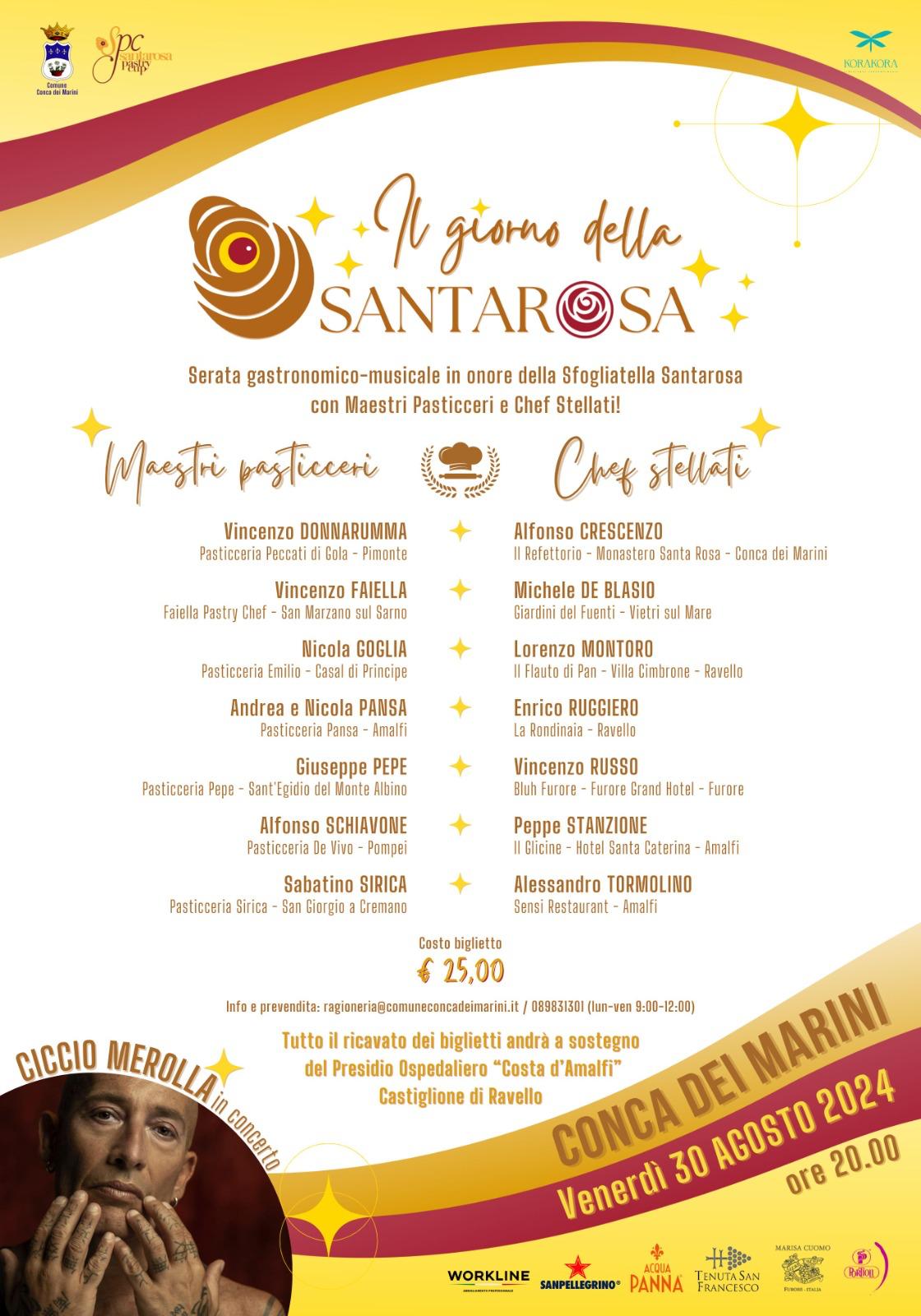 Il Comune in collaborazione con l’associazione Korakora e col Team di Santarosa Pastry Cup, di cui questi ultimi si impegnano a far conoscere l’unicità di questo dolce, hanno dato vita, già da diversi anni, all’imperdibile evento “Il giorno della Santarosa”, il dolce esclusivo della città marittima di Conca Dei Marini. In questa giornata, il 30 agosto, c’è una rievocazione dell’antico gesto di Santa Rosa da Lima, la santa a cui era dedicato il convento di clausura, che proprio alla fine di agosto donava annualmente la sfogliatella ai cittadini.