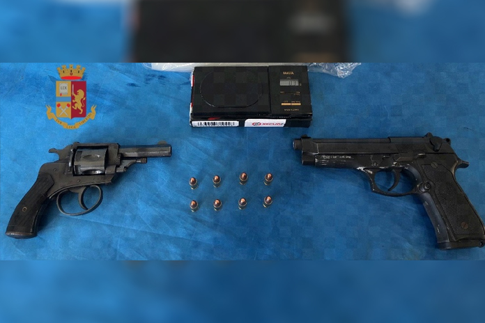 I poliziotti hanno rinvenuto, in una cantinola in uso ad un uomo e  trasformata in abitazione, una pistola Beretta semiautomatica cal. 9×21 mm con matricola parzialmente abrasa completa di caricatore con 8 cartucce Luger cal. 9×19 mm e una pistola a tamburo Lebel cal. 8 priva di matricola occultate in uno stereo mentre, in un mobile della cucina, hanno trovato un bilancino di precisione.