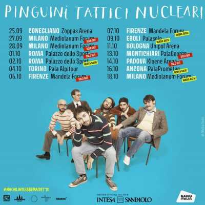 L’attesissimo tour dei Pinguini Tattici Nucleari, programmato per il prossimo febbraio, è stato rinviato a settembre e ottobre 2021 a fronte del permanere dello stato di emergenza sanitaria: con la nuova programmazione del tour, prodotto da BPM Concerti e Trident Music, sono stati aggiunti altri 5 show agli 8 concerti originariamente programmati, quasi tutti attualmente sold out. Tra le nuove date annunciate anche una tappa al Sud: il 9 ottobre 2021 al PalaSele di Eboli.