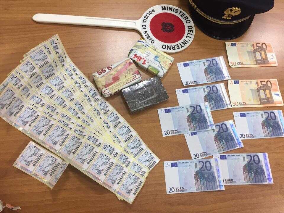 Nella serata di ieri, i poliziotti hanno notato il giovane in via Fratelli Rosselli. Dopo averlo raggiunto, lo hanno sottoposto a perquisizione, trovandolo in possesso di tre panetti di hashish – per un peso di oltre 300 grammi – e di 102 marche da bollo false, ognuna del valore di 16 euro.