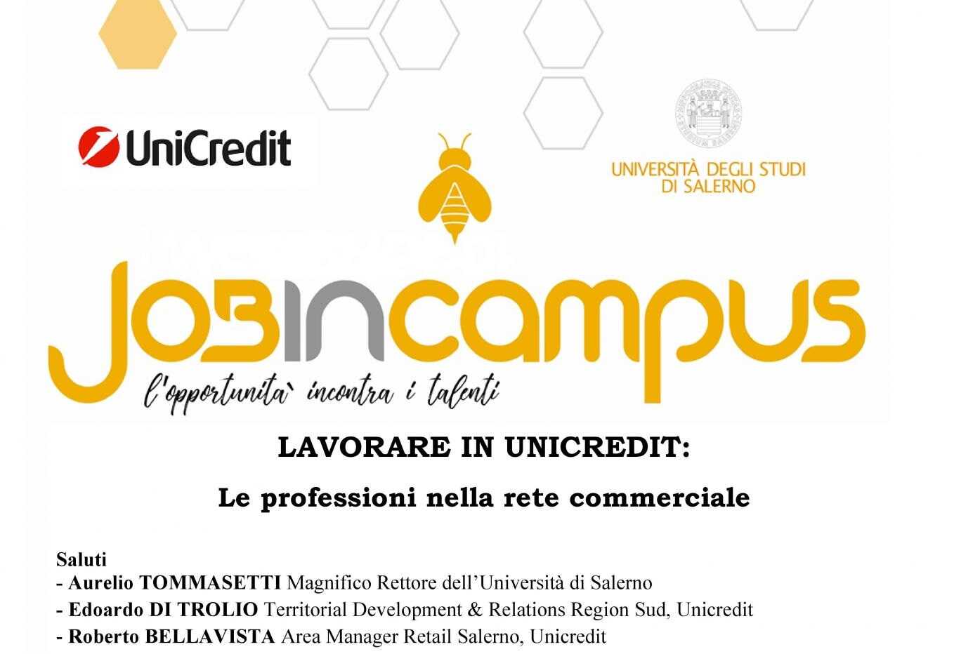Dopo la grande partecipazione all’incontro dell’11 marzo, tornano in Ateneo i responsabili di Unicredit, che incontreranno i nostri laureati e laureandi domani alle ore 10:00 nell’Aula delle Lauree “G. De Rosa” (Edificio D2 del Campus di Fisciano).