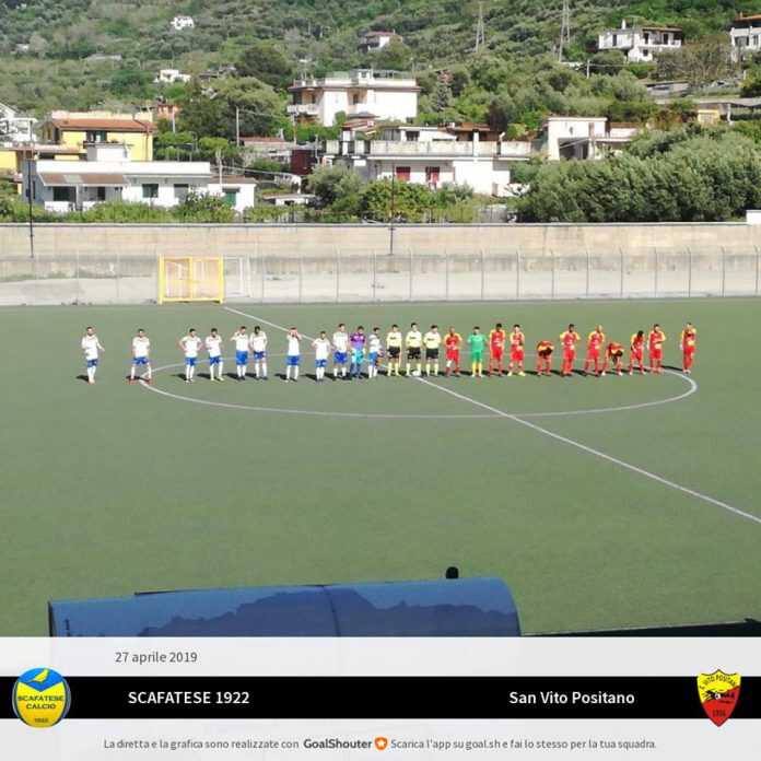 E’ fatta. La Scafatese scaccia via i fantasmi e salva la categoria eccellenza. Un vero sollievo per i tifosi e per il numero uno patron Vincenzo Cesarano, anche per Amarante un bel pericolo scampato. Termina 2 – 1 non senza sofferenze. Canarini in vantaggio con il bomber Sperandeo che ritrova il gol di rigore.Al minuto numero 34’ primo momento clou del match: fallo di mani nell’area giallorossa e calcio di rigore per la Scafatese che Sperandeo, con la freddezza che gli è consona, trasforma. Cinque minuti dopo il San Positano riacciuffa con Carfora. lesto a sfruttare un’indecisione della retroguardia gialloblu e a beffare Menzione con un tocco di destro.La ripresa si apre subito con la Scafatese in avanti: al 51’ solito tiro a giro sul secondo palo di Lino Siciliano che lascia in apnea il Varone ma termina fuori di un nulla. Il San Vito resta in 10 per l’espulsione di Terminiello. Siciliano ha una marcia in più sulla sinistra e all’80’ sfrutta la sua tecnica per procurarsi il secondo rigore di giornata, quello decisivo: dal dischetto Rinaldi riporta in vantaggio il team gialloblu. Gli ultimi 10 minuti più recupero sono per cuori forti: all’89’ Menzione si supera. Adesso testa al futuro. Da sistemare società, questione stadio ed un occhio alla nuova gestione comunale che verrà