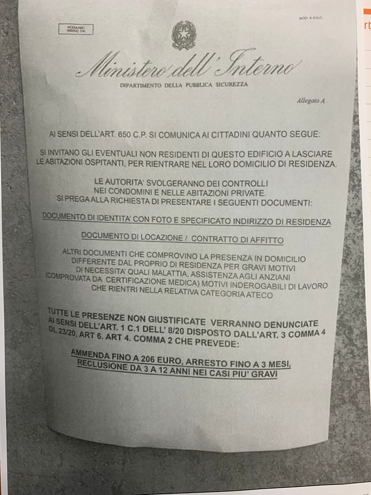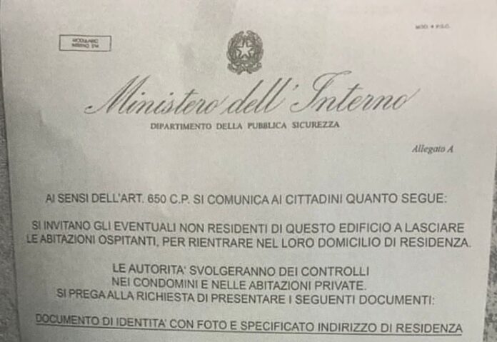 Si tratta di un tentativo di truffa, il manifestino scritto su carta intestata del ‘ministero dell’Interno-dipartimento della pubblica sicurezza’, con il logo della Repubblica Italiana, intima ai sensi dell’art. 650c.p. ai cittadini non residenti di lasciare l’edificio e di rientrare