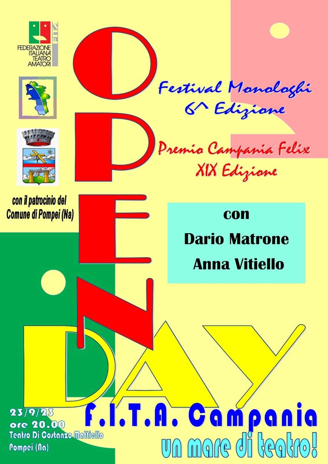 Lo scorso 23 settembre presso il teatro “Di Costanzo Mattiello” di Pompei, in concomitanza con la consegna del premio Campania Felix, concorso che premia gli spettacoli messi in scena dalle compagnie di teatro amatoriale che giunto alla diciannovesima edizione, si è tenuto il 6° festival del monologo sezione Campania.