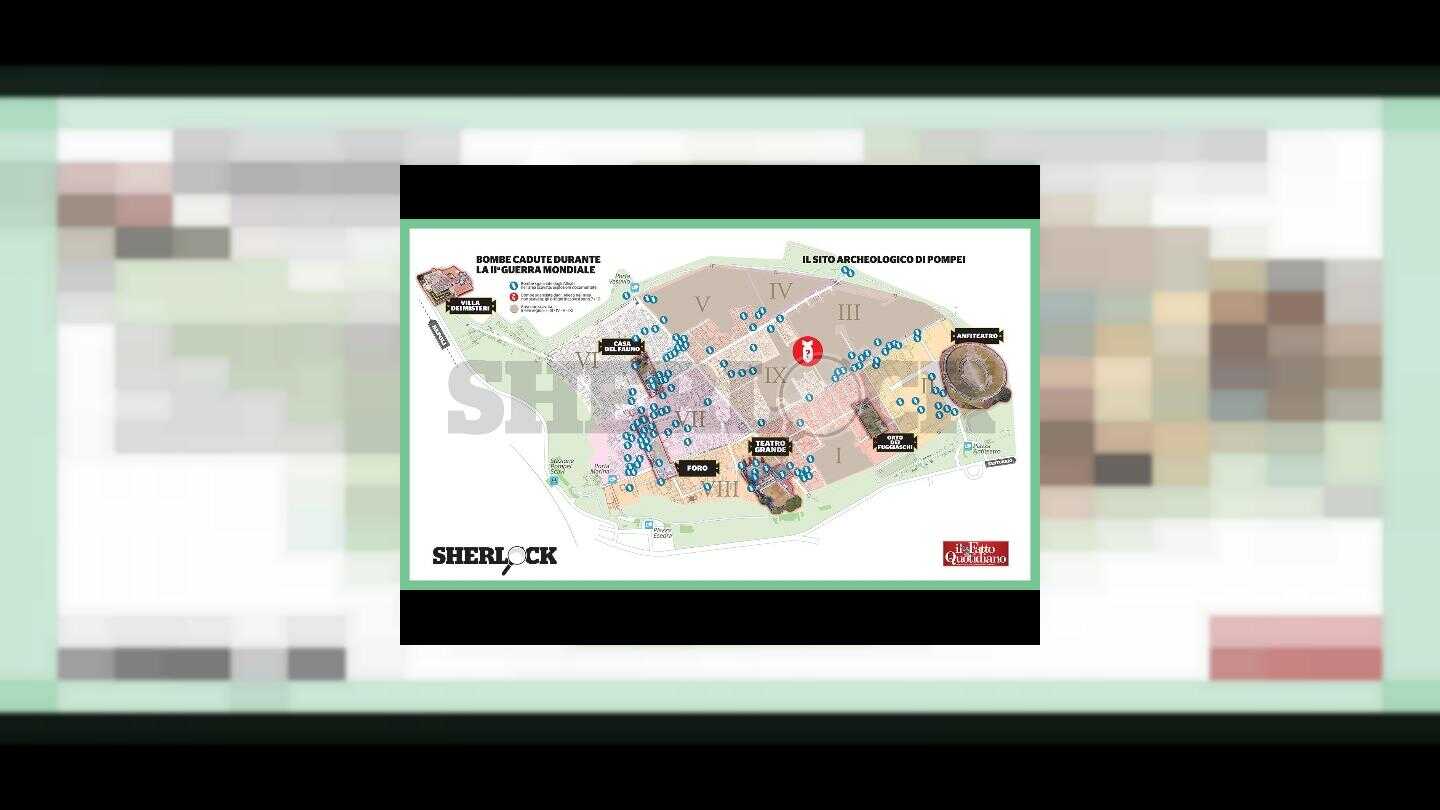 Un segreto finora inviolato. Ma qualcosa si può fare, se si vuole. Sempre fuoco. Sempre fiamme. È il destino di Pompei: prima il Vesuvio, poi le bombe della guerra. Ma qui il passato riemerge sempre. Così, insieme con i resti romani più famosi del mondo, adesso rischiano di tornare alla luce gli ordigni sganciati dalle forze alleate nel 1943: sette, forse addirittura dieci bombe inesplose.Cosa minaccia Pompei? Nel sottosuolo del sito archeologico tra i più famosi al mondo si nasconde un pericolo di devastante potenza. Un rischio che gli esperti conoscono, ma che non è facile disinnescare: almeno 10 ordigni inesplosi, tutti localizzati nell’area del Parco archeologico ancora da scavare (le “Regiones” I-III-IV-V-IX).Il 24 agosto 1943 è il giorno in cui le forze Alleate sganciarono su Pompei 165 bombe, in nove incursioni aeree. Fatalità, l’eruzione che nell’antichità avrebbe devastato Pompei e le altre città sotto il Vesuvio avvenne proprio il 24 agosto, del 79 d.C..Per la prima volta -nell’inchiesta esclusiva di “Sherlock” in edicola oggi sul Fatto Quotidiano – vengono resi noti documenti esclusivi dell’Aerofototeca nazionale. Strisciate aeree e rapporti ufficiali in cui si documentano – con le immagini prodotte dagli Alleati per scopi di ricognizione durante la “Campagna d’Italia” del 1943-1945 – le 165 bombe sganciate su Pompei: dagli spezzoni incendiari da 4 libbre/1,8 kg fino alle grandi “cookie” HC da 4.000 libbre/1.800 kg chiamate anche le “grandi demolitrici”.