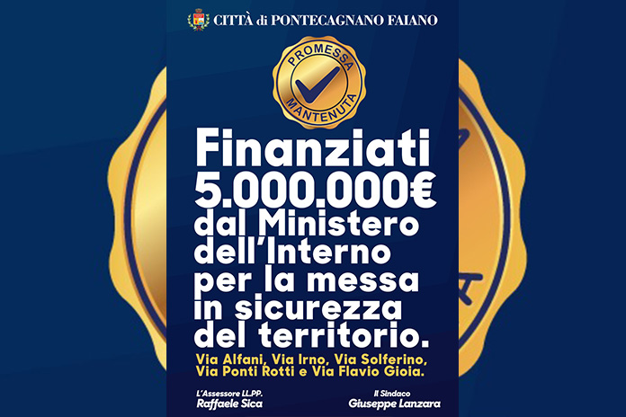 Il Ministero dell’Interno ha finanziato i lavori di ammodernamento destinati alle seguenti arterie del territorio: Via Alfani (700.000,00 euro), Via Irno (504.000,00 euro, con il cofinanziamento dell’Anas), Via Solferino (999.000,00 euro), Via Ponti Rotti e traverse (1.998.000 euro), Via Flavio Gioia (999.000,00 euro).