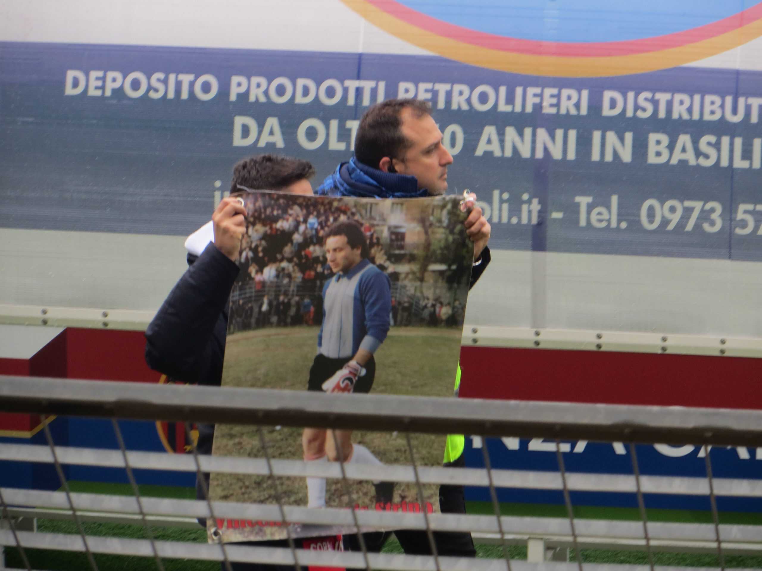 Poi il giro di campo di un giovane sostenitore torrese, che ha esposto una gigantografia dello storico portiere corallino, in forza ai lucani agli inizi degli anni ’80, raccogliendo il sentito applauso del Viviani.