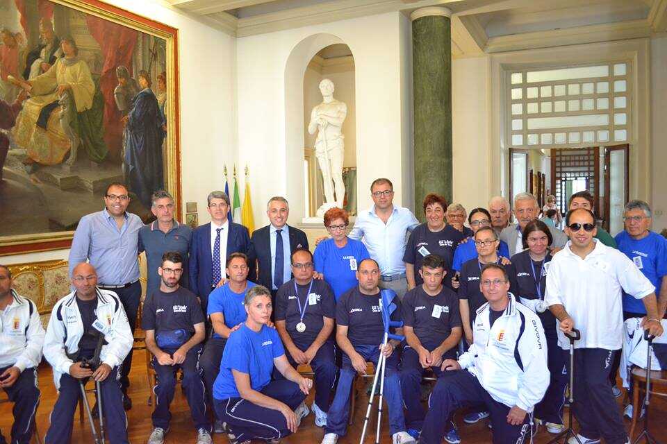 Si sono distinti ai Campionati Nazionali Paralimpici di Atletica Leggera di Isernia. Ieri pomeriggio, a Palazzo di Città, il sindaco Servalli ha premiato gli atleti dell’A.S.D. La Rondine. Durante la cerimonia è stata consegnata una targa di ringraziamento alla presidente dell’Asd La Rondine, Anna Musumeci, a Nicola Russo, Medaglia d’Oro specialità 100, 200, 400 metri; Marzio Benevento, Medaglia d’Oro specialità 100 metri e lancio del disco, Medaglia d’Argento lancio del peso; Teresa Adinolfi, Medaglia d’Oro specialità lancio del peso e del disco; Federico Apicella, Medaglia d’Argento specialità lancio della clava; Filippo Lamberti, Medaglia d’Argento specialità lancio del disco; Antonio Apicella, Medaglia d’Oro specialità lancio del peso e 100 metri; Massimo Proietti Medaglia d’Argento specialità 100 metri e la consegna di una medaglia a Maddalena Luciano, Domenico Vangone, Ettore Scardi, e Michele Apicella.