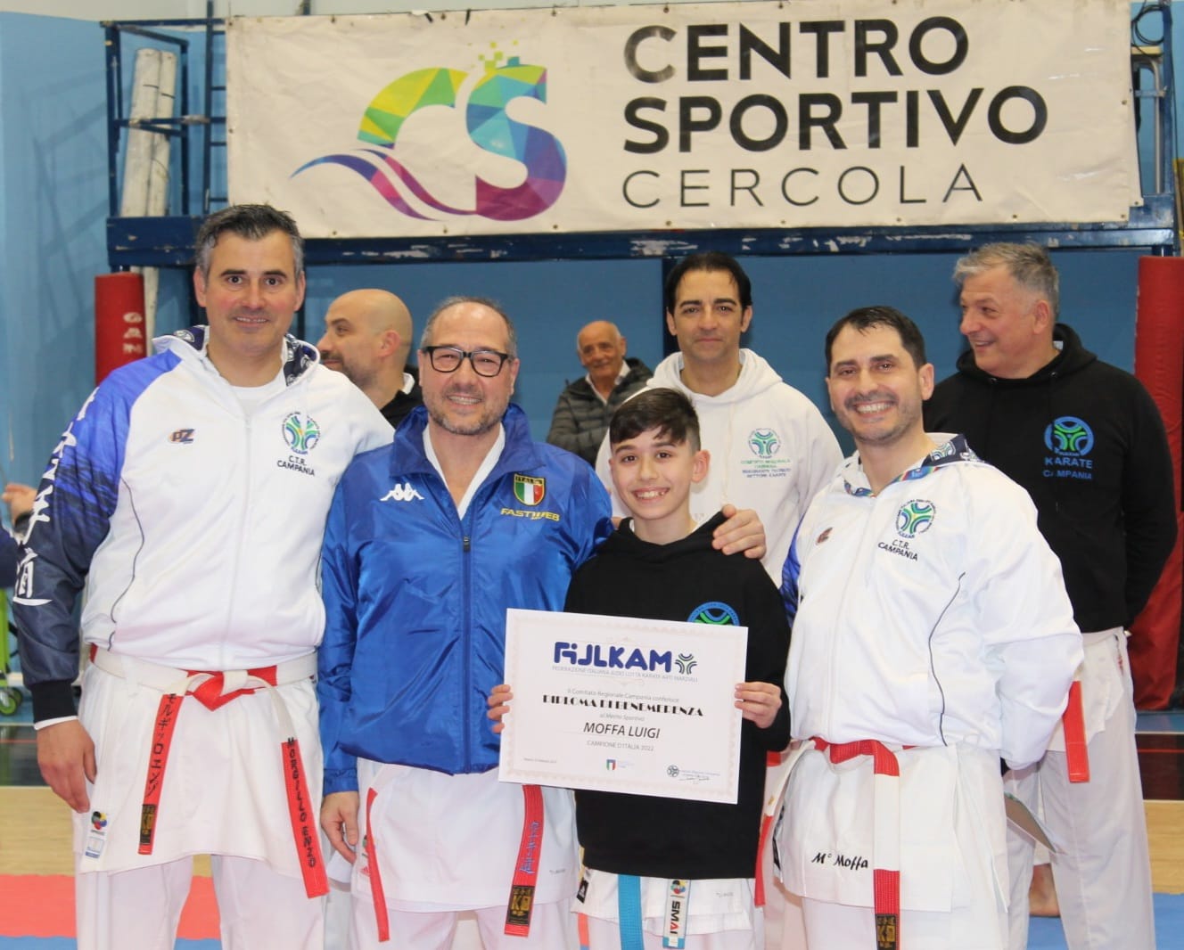 Premiati dal Comitato Regionale Fijlkam Campania, capitanato dal Presidente dei tre settori Antonio Bracciante, con la presenza dei componenti della consulta M° Lello Andreozzi, M° Emilio Fotino, M° Rosario D’Angelo, M°Franco Iodice, con un diploma di benemerenza Fijlkam, i campioni campani che hanno conquistato il podio all’ultima edizione del Campionato Italiano di Karate.