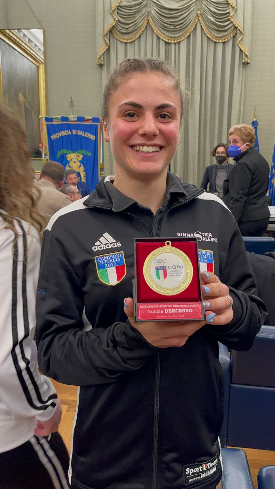 Si è tenuta oggi, presso il Salone “Girolamo Bottiglieri” – Palazzo della Provincia di Salerno, la cerimonia di consegna delle “Benemerenze Sportive Provinciali 2020-21”, che ha visto il conferimento all’atleta di Ginnastica Salerno Nunzia Dercenno del Premio “Giovani Speranze” per i meritati risultati conseguiti e per l’impegno profuso nel dare lustro allo sport diffondendo i sani valori di cui è portatore.