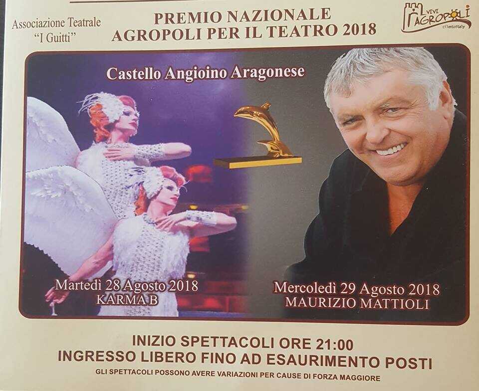 E’ in programma questa sera e domani, presso il Castello Angioino Aragonese di Agropoli, la XVIII edizione del Premio nazionale “Agropoli per il teatro 2018”. L’iniziativa, operata a cura dell’Associazione “I guitti”, è patrocinata dal Comune di Agropoli. A ricevere l’ambito premio saranno: il duo siciliano, ideatore di Karma B, del teatro Bagaglino di Roma e l’attore Maurizio Mattioli. In entrambi i casi, il premio verrà consegnato dal Sindaco del Comune di Agropoli, Adamo Coppola e dall’assessore allo Spettacolo, Gerardo Santosuosso.
