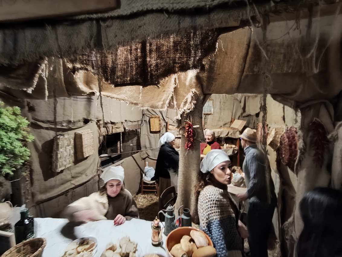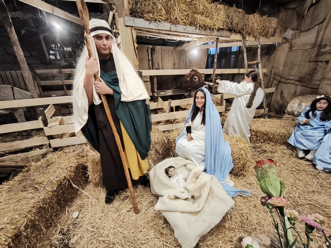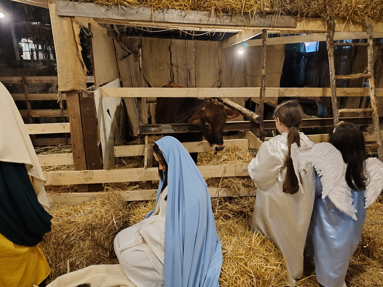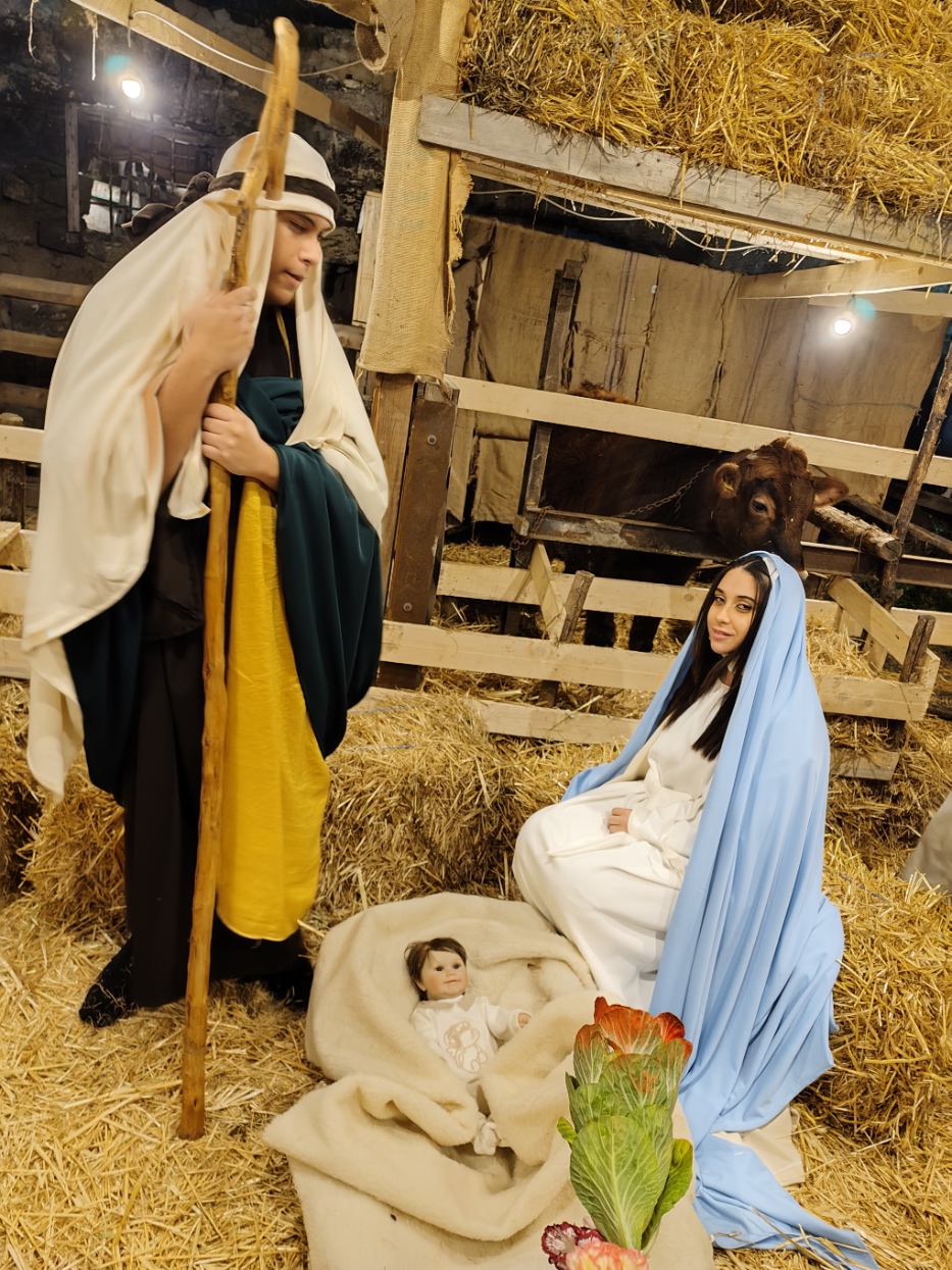 Il momento più emozionante del percorso è senza dubbio l’arrivo alla grotta della Natività. Qui, accanto a un vero bue e un asinello, la scena si completa con la presenza di bambini vestiti da angioletti, un dettaglio che commuove e rende la rappresentazione ancora più intensa e partecipata. L’unica cosa non rappresentata da persone viventi è il bambinello, mentre San Giuseppe e la Madonna sono dei veri personaggi, con Maria che resta inginocchiata e Giuseppe appoggiato al suo bastone. Non mancano i re magi, che almeno nella serata del 26 dicembre, alla quale si riferiscono le nostre foto, sono ben lontani dalla grotta. Sarà possibile vederli ai piedi di Gesù nella rappresentazione del 6 gennaio.