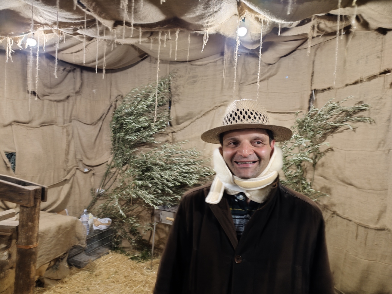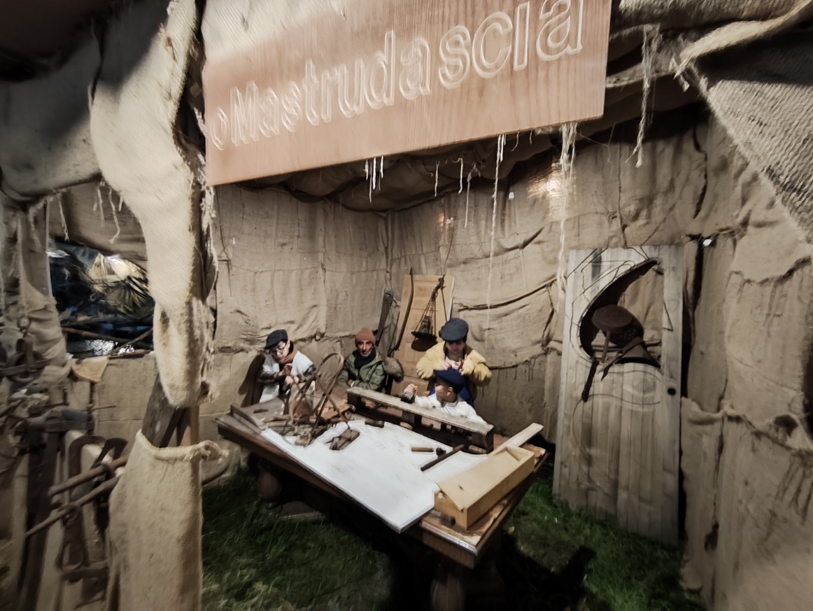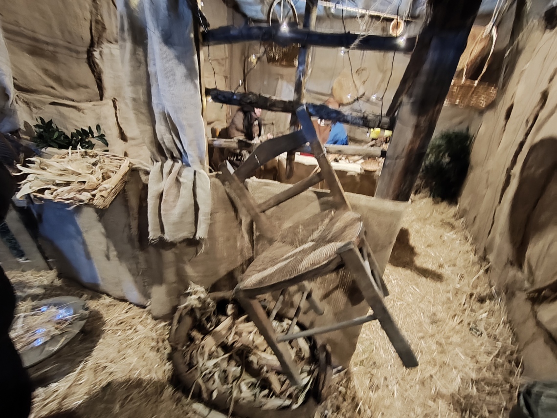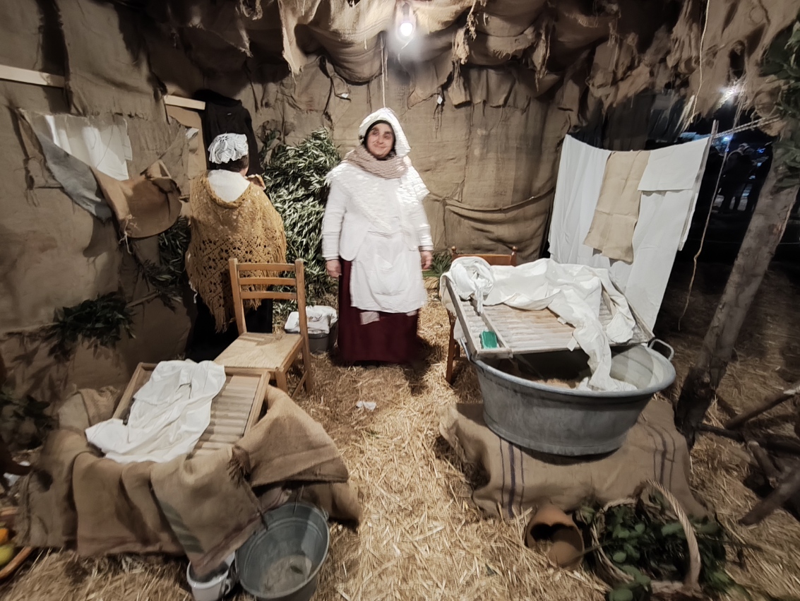 Il momento più emozionante del percorso è senza dubbio l’arrivo alla grotta della Natività. Qui, accanto a un vero bue e un asinello, la scena si completa con la presenza di bambini vestiti da angioletti, un dettaglio che commuove e rende la rappresentazione ancora più intensa e partecipata. L’unica cosa non rappresentata da persone viventi è il bambinello, mentre San Giuseppe e la Madonna sono dei veri personaggi, con Maria che resta inginocchiata e Giuseppe appoggiato al suo bastone. Non mancano i re magi, che almeno nella serata del 26 dicembre, alla quale si riferiscono le nostre foto, sono ben lontani dalla grotta. Sarà possibile vederli ai piedi di Gesù nella rappresentazione del 6 gennaio.