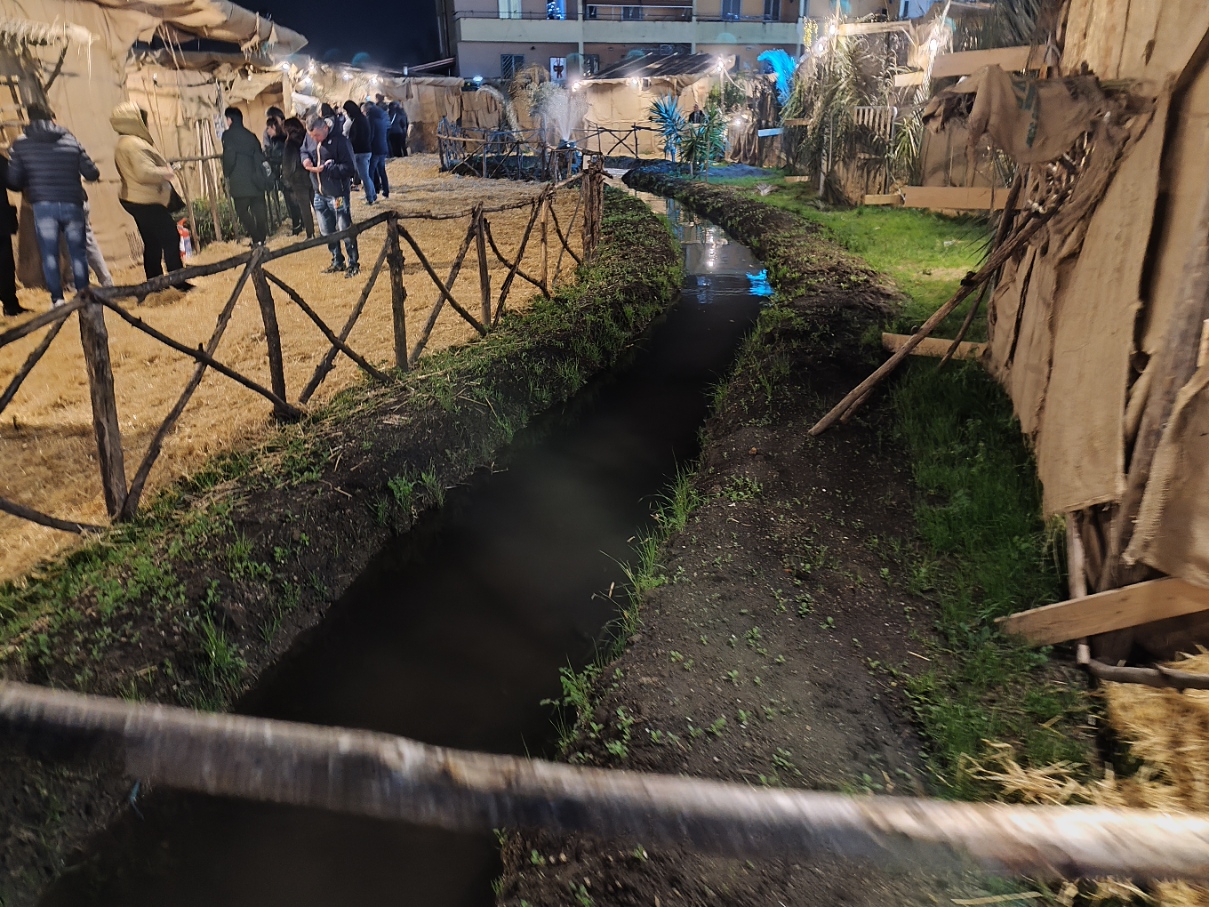 Fin dall’ingresso, l’atmosfera è quella di un viaggio nel tempo: luci soffuse, scenografie fedeli alla tradizione e una meticolosa ricostruzione degli ambienti della Palestina di duemila anni fa accompagnano il pubblico lungo il percorso. C’è anche un piccolo ruscello che attraversa l’area e che rende tutto più suggestivo, compresi i ponti in legno per attraversarlo.