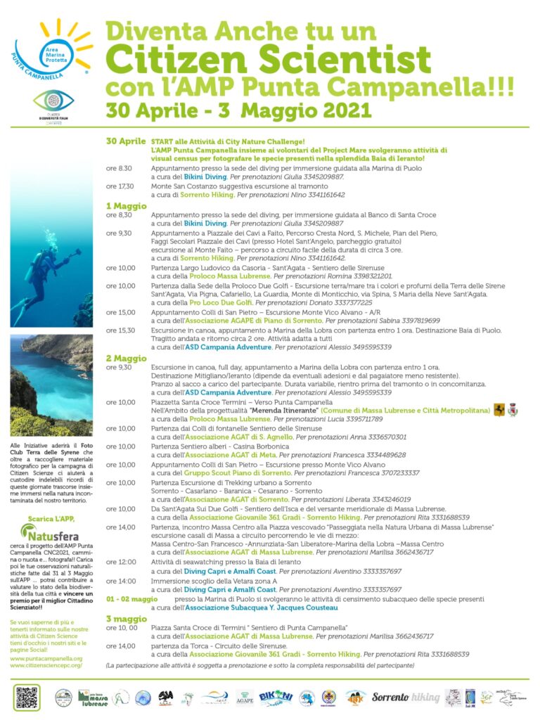L’evento parte venerdì 30 con appuntamento nella Baia di Ieranto con il nuovo gruppo di volontari del Project Mare, con un’immersione a Puolo a cura del Bikini Diving e un’escursione al tramonto al Monte San Costanzo organizzata da Sorrento Hiking. Le attività proseguiranno nei successivi 3 giorni, con altre escursioni, immersioni guidate, seawatching, giri in canoa nelle acque dell’Amp Punta Campanella.
