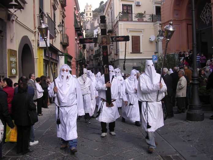 A Sarno è tutto pronto per la processione dei Paputi, che inizierà alle ore 7.00 del mattino. Il rito si ripete dal 1200 circa, secondo una tradizione che si tramanda di padre in figlio e che prende vita nelle strade della città prima ancora che sorga il sole. Si tratta di un corteo di uomini incappucciati (per questo chiamati “Paputi”) che portano la croce del Cristo per le strade del paese, fermandosi ad ogni Altare della Reposizione, allestito non in chiesa bensì all’aperto, su palchetti vari. Lì, le donne intonano canti di dolore in memoria del Cristo defunto. Le diverse congregazioni parrocchiali indossano una tunica bianca con cappuccio alzato e, per riconoscersi tra loro, hanno un proprio cordone e una propria ornatura. Fanno eccezione la confraternita di San Matteo (che indossa una tunica rossa per simboleggiare la preminenza sulle altre chiese sarnesi) e San Francesco (che porta, invece, il saio monacale). La processione, oltre a ricordare la Via Crucis compiuta da Gesù Cristo, simboleggia il passaggio tra la vita e la morte e l’eliminazione del vecchio a favore del nuovo. Tutti di nuovo in piazza in serata, procedendo con l’adorazione della croce.