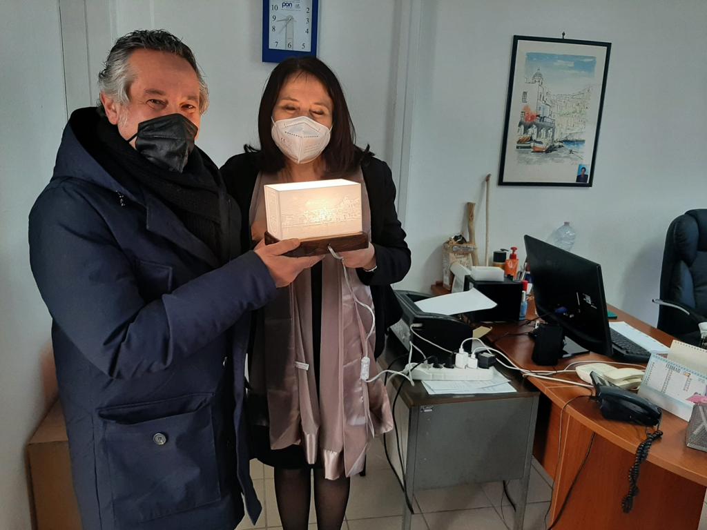 Michele Assante del Leccese, assessore e docente dell’isola, gli studenti dell’IIS F. Caracciolo-G. Da Procida” con la Dirigente Maria Saletta Longobardo ricevono un prodotto 3D del prof. Pietro Balzano e dei suoi ragazzi, un progetto unico, quasi impensabile: 3kg di PLA, plastica biodegradabile, 2 stampanti al lavoro, venti giorni di incessante stampa.