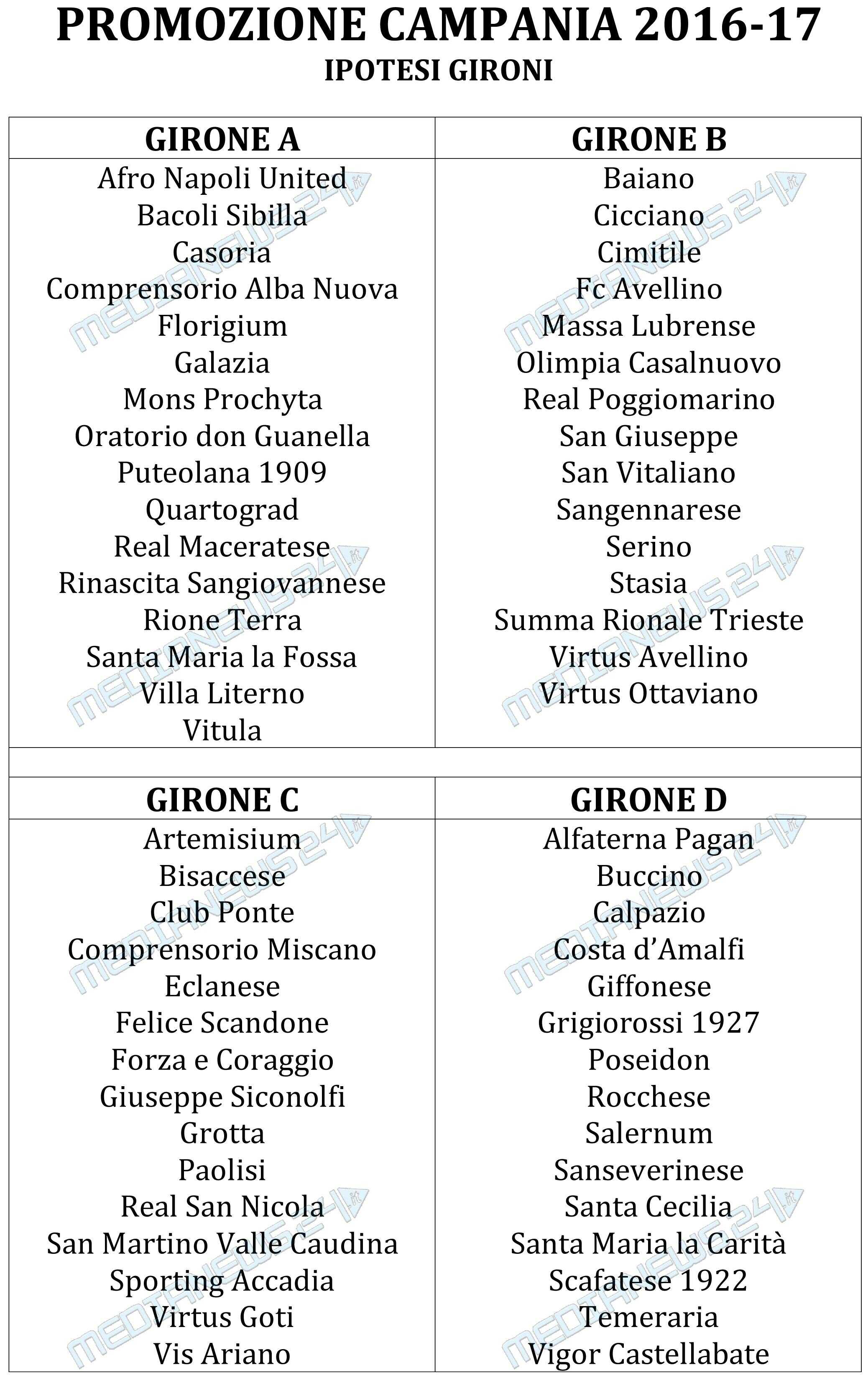Un campionato a ranghi ridotti, con 61 squadre invece delle canoniche 64. La Lnd Campania potrebbe optare per un solo girone con 16 club e 3 gruppi composti invece da 15 squadre ciascuno. Criterio di prossimità geografica alla mano, questa di seguito potrebbe essere un’ipotesi percorribile per i 4 raggruppamenti della Promozione Campania 2016-17, con una possibile “variante” relativa all’inserimento del Massa Lubrense nel girone con compagini napoletane e casertane e del Casoria nel raggruppamento vesuviano-irpino: