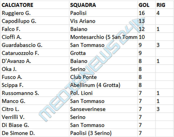 Resta invariata ai piani alti la graduatoria dei bomber nel girone C di Promozione, complici anche i rinvii delle gare San Tommaso-Baiano e San Martino-Paolisi (iniziata e poi sospesa). L’unica eccezione riguarda Cioffi (nella foto) che sale in doppia cifra, sommando i 5 gol realizzati nella prima parte della stagione col San Tommaso a quelli segnati tra le file del Montesarchio.