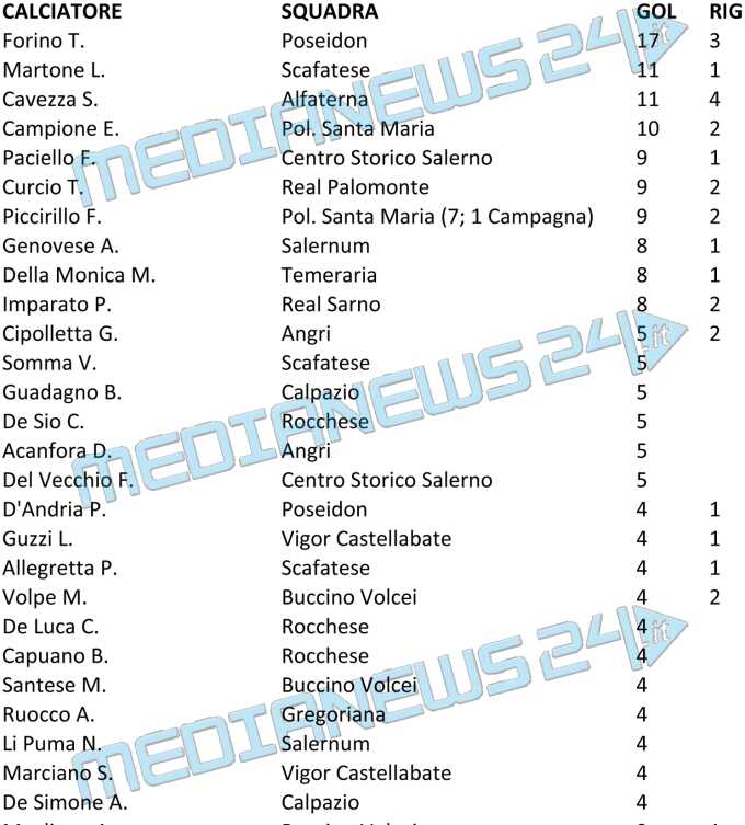 Forino (Poseidon) allunga in vetta alla graduatoria dei bomber nel girone D di Promozione. Un gol nel rocambolesco successo esterno contro la Temeraria permette di portare a +6 il vantaggio sugli immediati inseguitori, con Martone (Scafatese) che aggancia Cavezza (Alfaterna) al secondo posto.