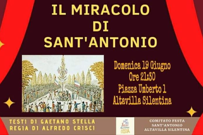 Si terrà domenica 19 giugno, in Piazza Umberto I ad Altavilla Silentina, la rievocazione storica del Miracolo di S. Antonio. L’idea nasce dal forte attaccamento degli Altavillesi al Santo protettore, protagonista secondo la credenza popolare, di un miracolo risalente al 1799, in cui la statua del Santo Antonio avrebbe salvato la città, favorevole alle idee giacobine e repubblicane, dagli spari del cannone dei sanfedisti.