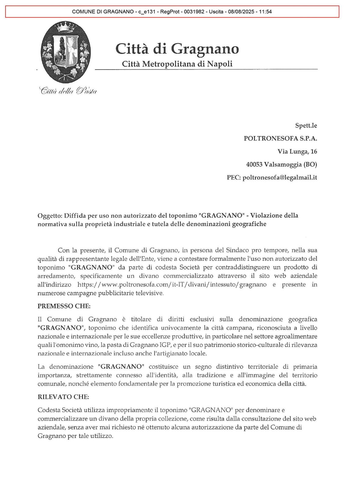 “Oggi, ho firmato una 𝐟𝐨𝐫𝐦𝐚𝐥𝐞 𝐝𝐢𝐟𝐟𝐢𝐝𝐚 che contesta l’𝐮𝐭𝐢𝐥𝐢𝐳𝐳𝐨 𝐧𝐨𝐧 𝐚𝐮𝐭𝐨𝐫𝐢𝐳𝐳𝐚𝐭𝐨 𝐝𝐞𝐥 𝐭𝐨𝐩𝐨𝐧𝐢𝐦𝐨 “𝐆𝐫𝐚𝐠𝐧𝐚𝐧𝐨” da parte di un’azienda operante nel settore dell’arredamento, che ha denominato un proprio prodotto, un divano in tessuto, con il nome della Città, commercializzandolo sul proprio sito ufficiale e promuovendolo attraverso campagne pubblicitarie televisive a diffusione nazionale.