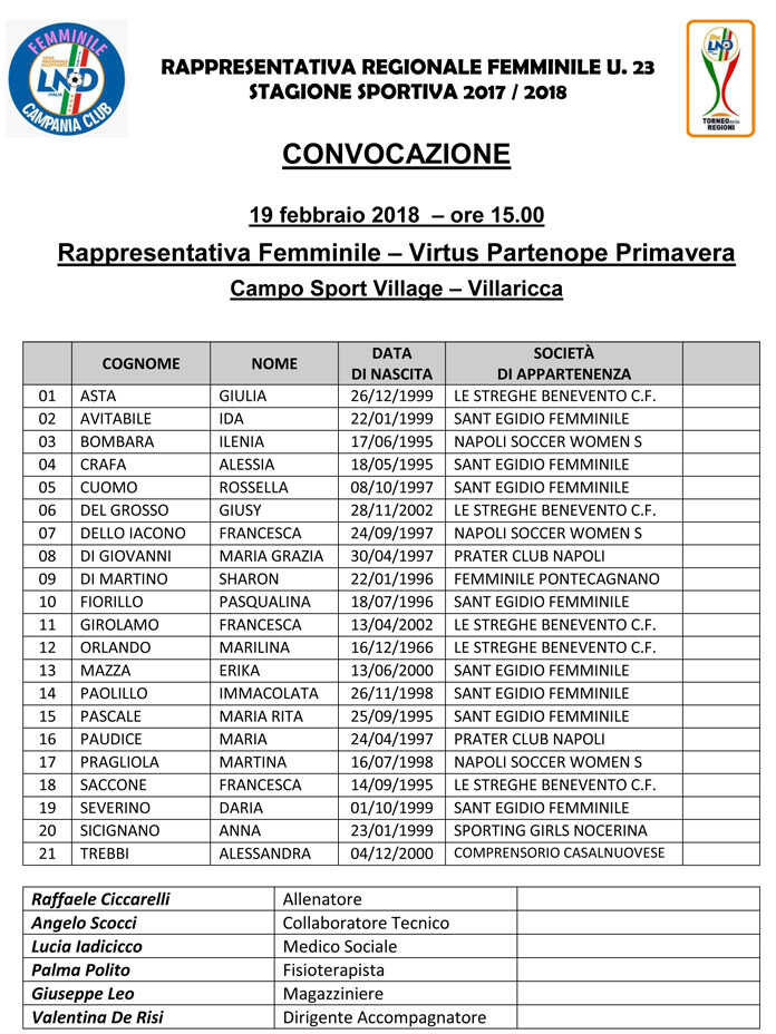Sono 21 le calciatrici convocate dal tecnico Raffaele Ciccarelli per il nuovo allenamento della Rappresentativa Campania di calcio femminile, in programma lunedì 19 febbraio a Villaricca.