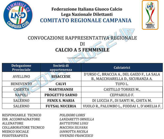 La Rappresentativa Campania di calcio 5 femminile si ritroverà ad Avellino per un nuovo allenamento in vista del Torneo delle Regioni LND. L’appuntamento è per lunedì 5 marzo alle ore 19 presso il campo CONI di via Morelli e Silvati.