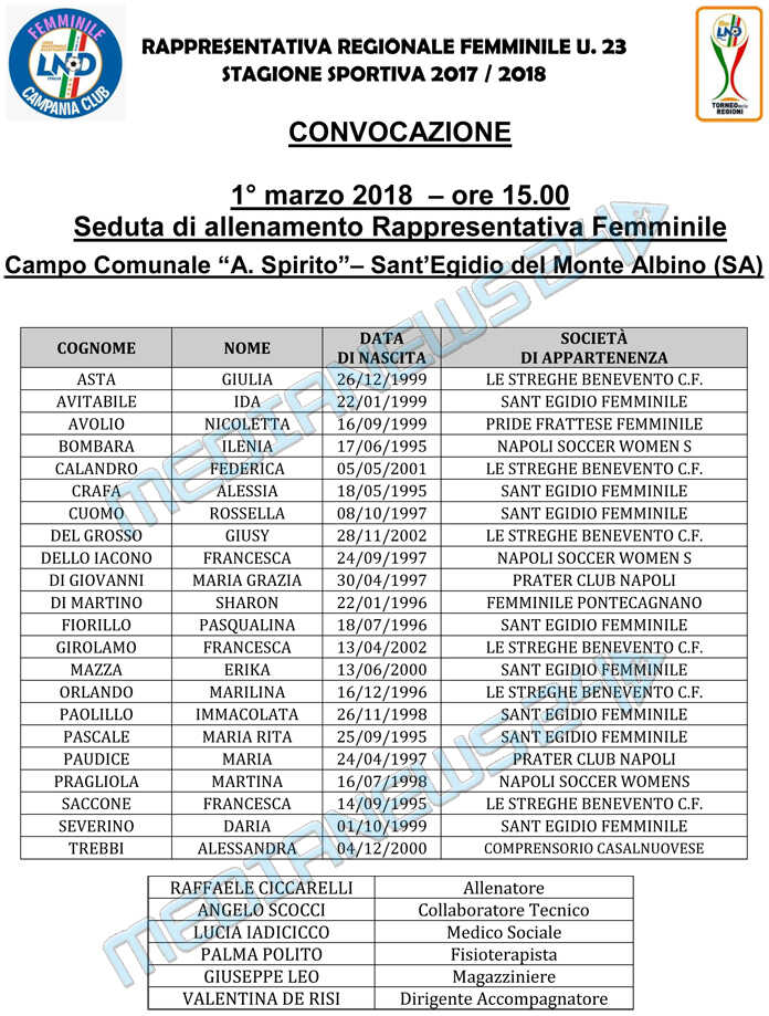 Nuovo allenamento per la Rappresentativa Campania di calcio femminile. Il tecnico Raffaele Ciccarelli ha convocato 22 atlete, che si ritroveranno domani pomeriggio alle 15 allo stadio comunale “Antonio Spirito” do Sant’Egidio del Monte Albino.