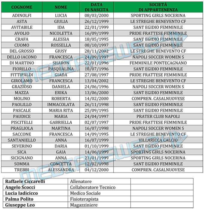 Nuovo raduno per la formazione della Rappresentativa Campania di calcio femminile, che sarà impegnata nel Torneo delle Regioni Lnd 2018. Le atlete, agli ordini dell’allenatore Raffaele Ciccarelli, si ritroveranno mercoledì 31 gennaio prossimo, alle 15, allo Sport Village di Villaricca (Na). Di seguito l’elenco delle convocate.