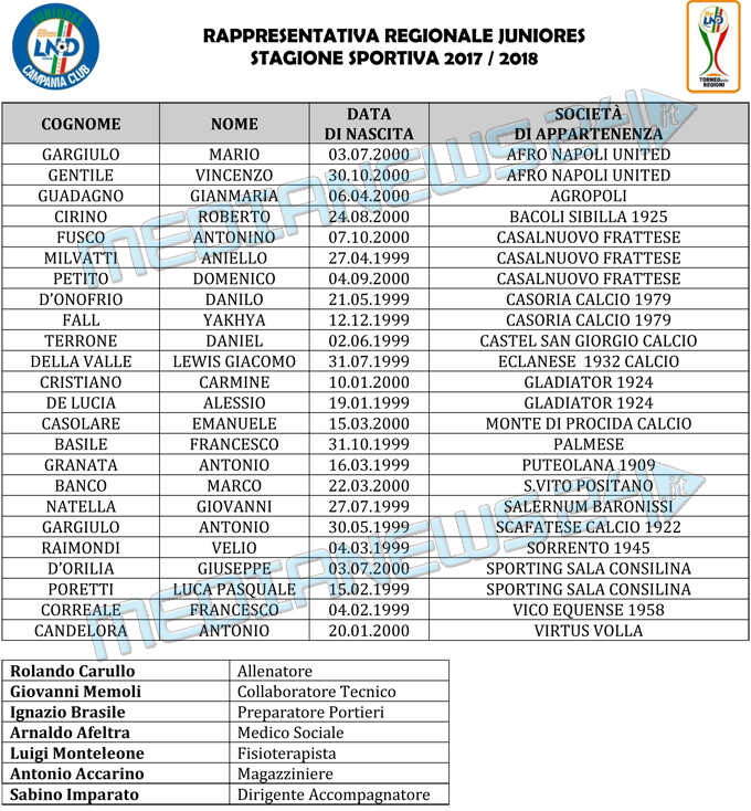 Nuova convocazione per gli atleti che andranno a formazione la Rappresentativa Campania Juniores al Torneo delle Regioni 2018. Mercoledì 14 febbraio gli atleti si ritroveranno alle 14 allo stadio Comunale di Montemiletto (Av). Di seguito l’elenco dei convocati.