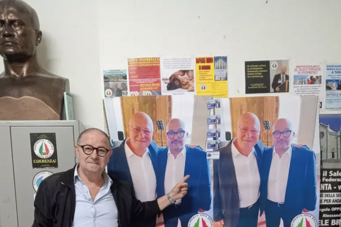 «Il Movimento Idea Sociale sostiene e vota Gennaro Sangiuliano alle prossime elezioni regionali», ha affermato Bruno, condividendo sui social una foto con lo stesso Sangiuliano accanto al simbolo del movimento e a un busto di Benito Mussolini.