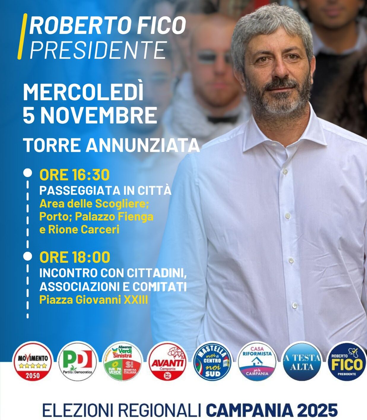 Con questo appuntamento, il candidato punta a rafforzare la propria presenza sul territorio, affrontando da vicino le problematiche e le potenzialità di un’area strategica come il Vesuviano. “La Campania ha bisogno di una politica che parta dai cittadini e dai territori – ha dichiarato Fico nei giorni scorsi – e Torre Annunziata è uno dei luoghi simbolo da cui ripartire per costruire una regione più giusta, sostenibile e solidale”.