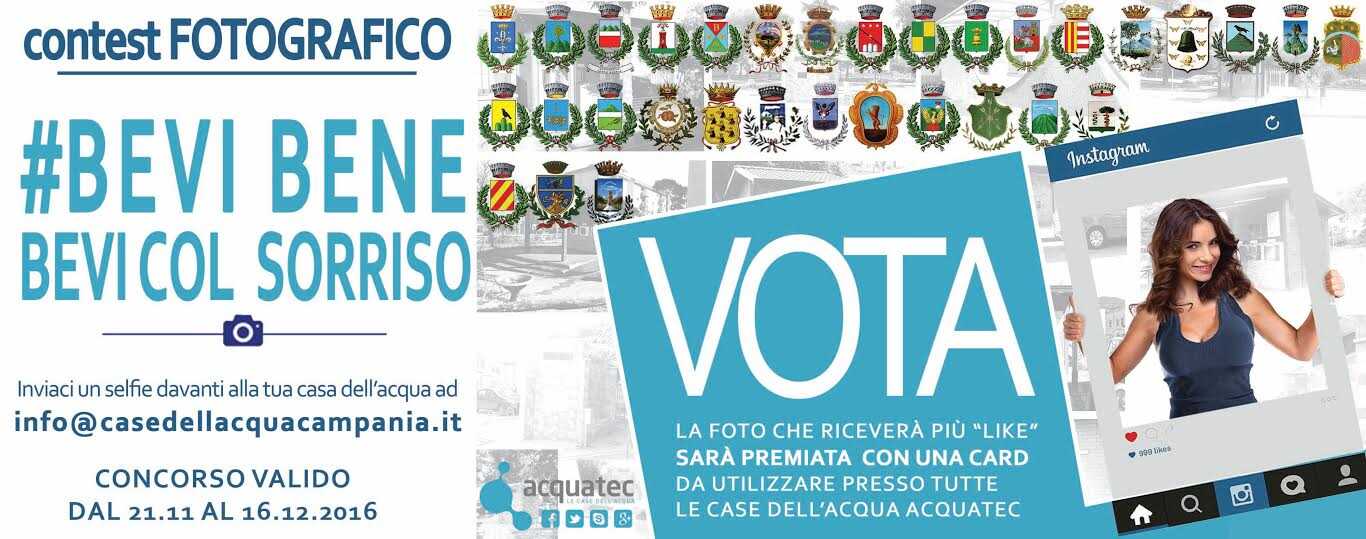 Acquatec, gestore di più di 50 Case dell’Acqua in più di 30 comuni in Campania, con la sinergia delle Amministrazioni comunali, ha lanciato il contest fotografico “Bevi bene, bevi col sorriso!”. I cittadini interessati dovranno scattarsi un selfie davanti alla Casa dell’Acqua del proprio comune. La foto con più like su Facebook verrà premiata con una card da utilizzare in tutte le casette Acquatec. Il concorso è valido dal 21 novembre al 16 dicembre e le foto potranno essere inviate a info@casedellacquacampania.it o sulla pagina Facebook di Acquatec.