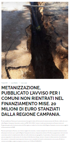 L’avviso è rivolto prioritariamente ai Comuni inclusi nel Programma generale di metanizzazione del Mezzogiorno ricadenti nel territorio della Regione Campania, ma non ancora oggetto di finanziamento del Mise.