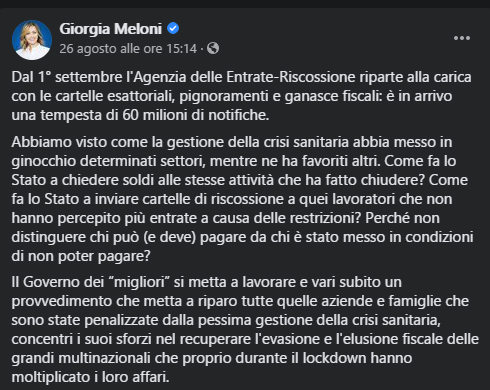 “Dall’1 settembre l’Agenzia delle Entrate-Riscossione riparte alla carica con le cartelle esattoriali, pignoramenti e ganasce fiscali: è in arrivo una tempesta di 60 milioni di notifiche”, ha scritto alcuni giorni fa su Facebook la presidente di Fratelli d’Italia Giorgia Meloni.